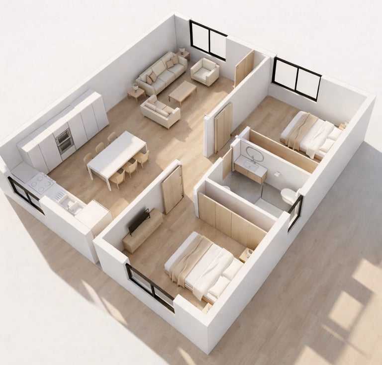 En este curso vamos a trabajar con un caso real: una vivienda de 65 m², súper típica y vendible, con living–comedor–cocina integrada, 2 dormitorios y 1 baño completo.